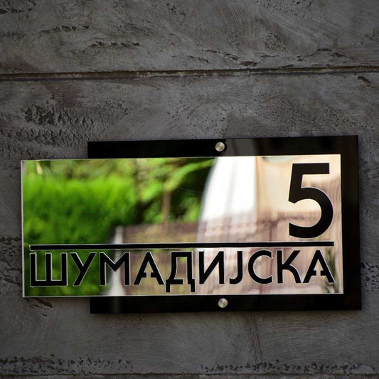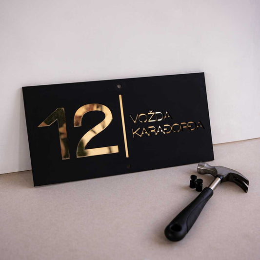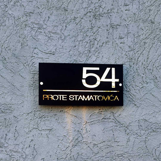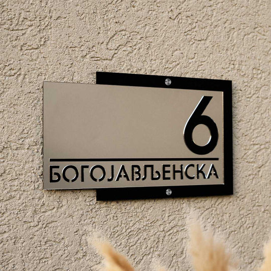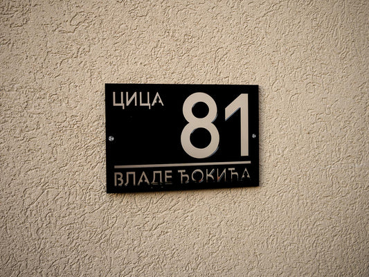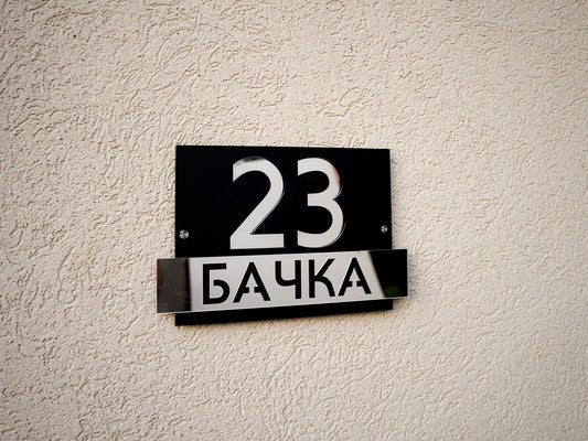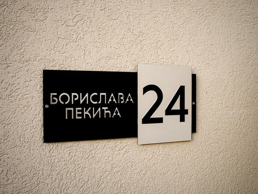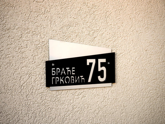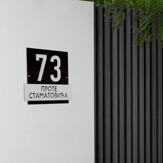 Moderni broj Oblika 5 ima elegantno izdignut deo s nazivom ulice ili prezimenom, dok se iza njega nalazi ploča s ciframa kućnog broja. Ovaj slojeviti dizajn ističe detalje i dodaje vizuelnu dubinu, pružajući savremeni izgled koji kombinuje stil i funkcionalnost.