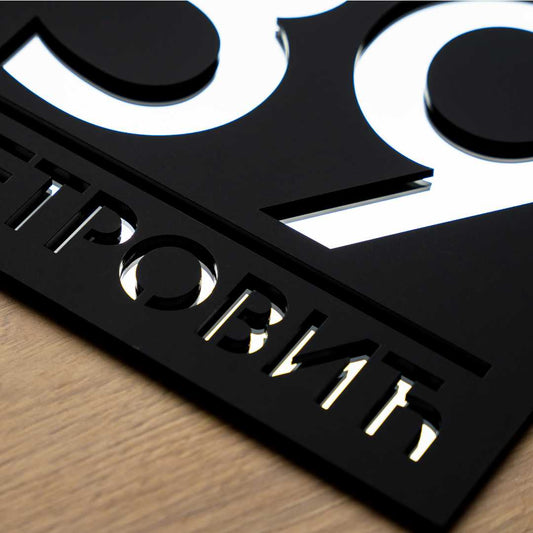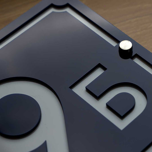 Moderni broj Oblika 1 sastoji se od dve pažljivo postavljene ploče koje stvaraju vizuelni efekat kao da prednja ploča lebdi iznad pozadinske. Ovaj dizajn donosi efekat dubine i daje broju elegantan okvir, čineći ga istovremeno upečatljivim i sofisticiranim dodatkom svakom prostoru.